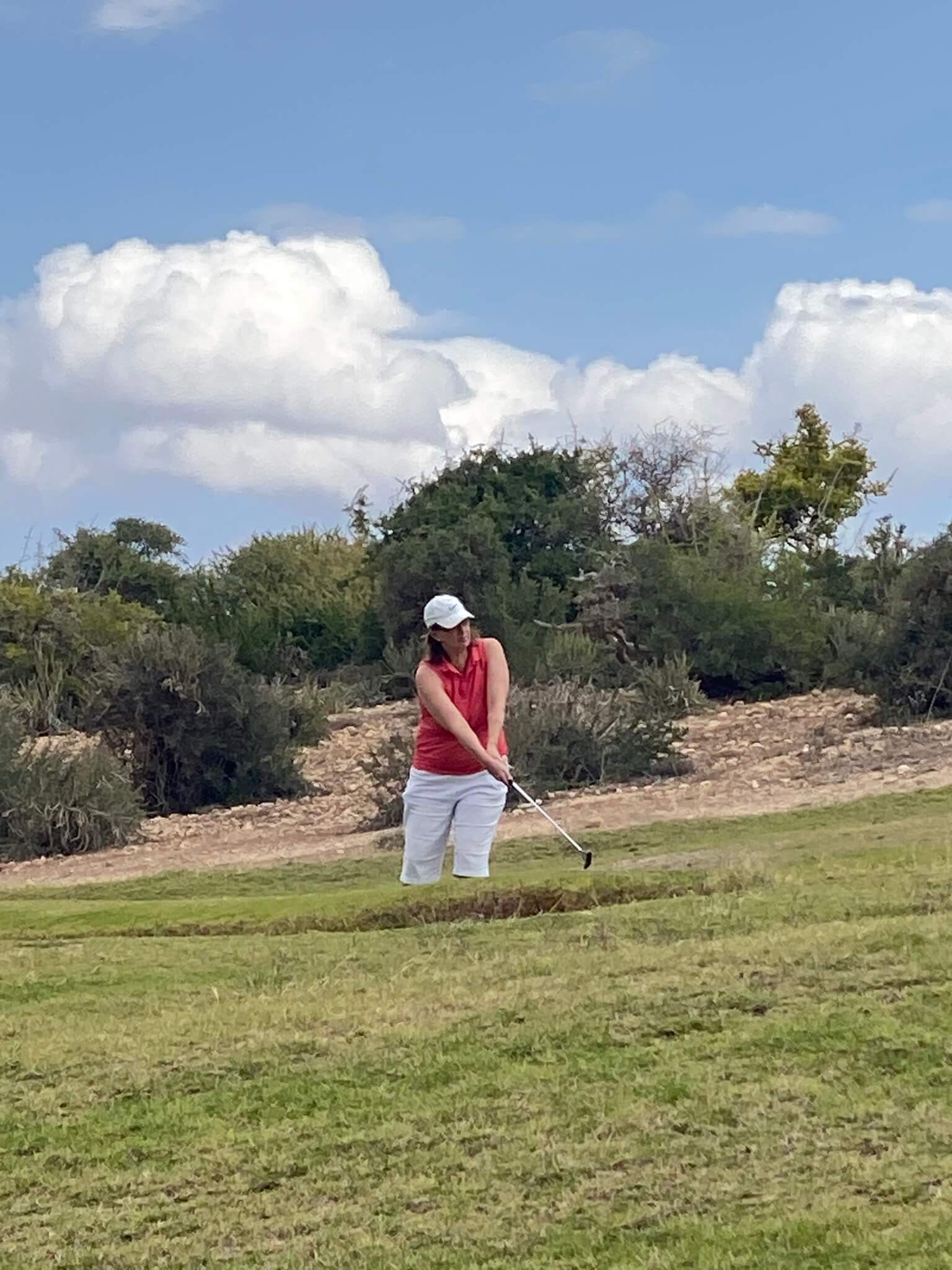Wir stellen uns vor wie die Ballsammler gegen Abend ausschwärmen und täglich jede Menge Bälle in der Schlucht aufsammeln. Ich trage hier nicht zu deren Einkommen bei. Mein vergammelter gefundener Srixon-Ball fliegt dank meinem Lieblingsschläger artig über die Schlucht auf´s Grün.