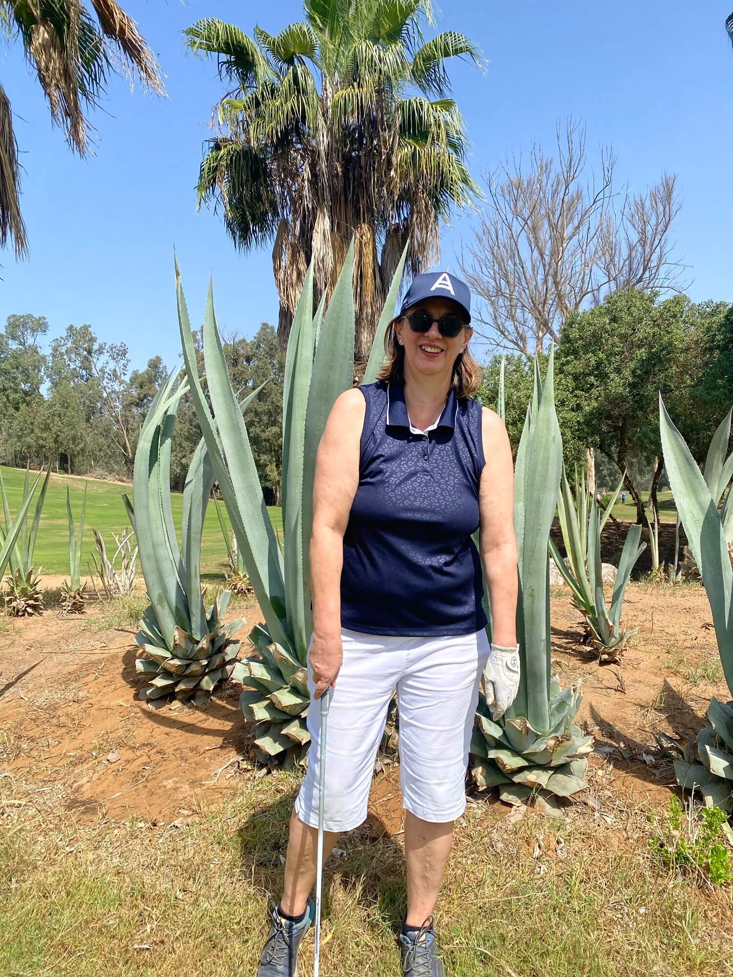 Die Beschriftung am Platz ist mehr als mangelhaft, so dass wir einige Zeit verplempern mit der Suche nach dem ersten Abschlag. Aber irgendwann geht es dann los. Ich haue heute alle Bälle vom Abschlag nach links und lasse deswegen nach ein paar Bahnen meinen Driver stecken. Wir haben eine schöne Runde, allerdings sind wir beim letzten Drittel alle einigermaßen platt, weil es wirklich sehr heiß ist und meistens windstill. Wenn mal ein Wind aufkommt, fühlt er sich an wie aus dem Backofen.