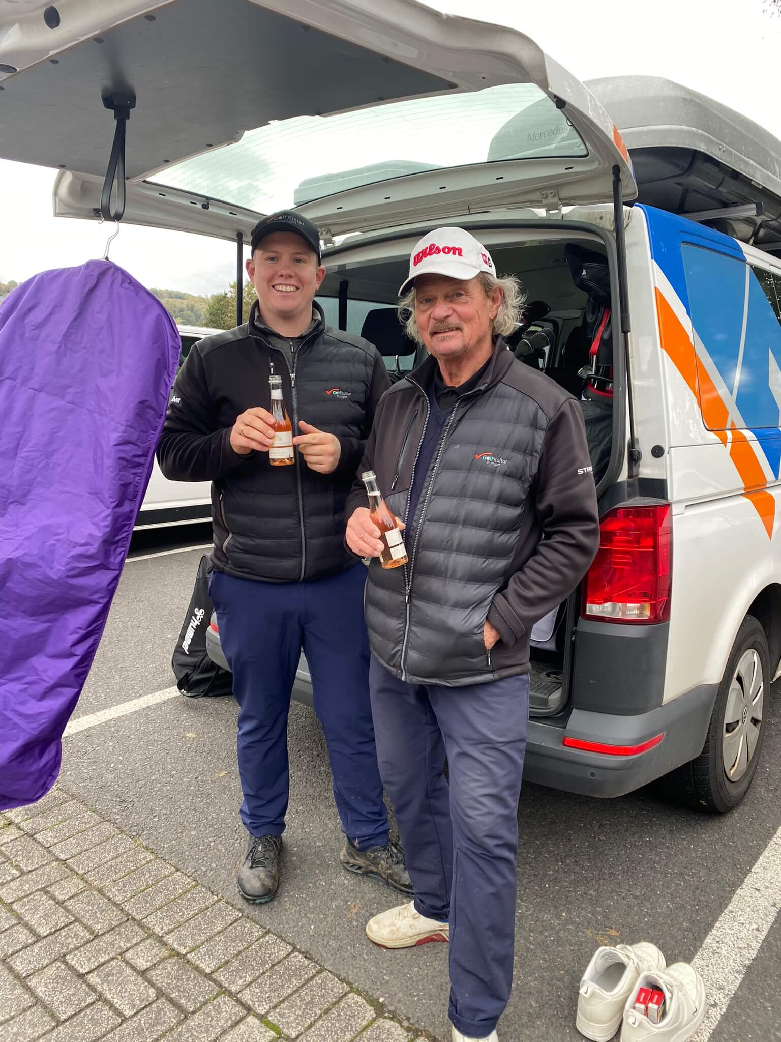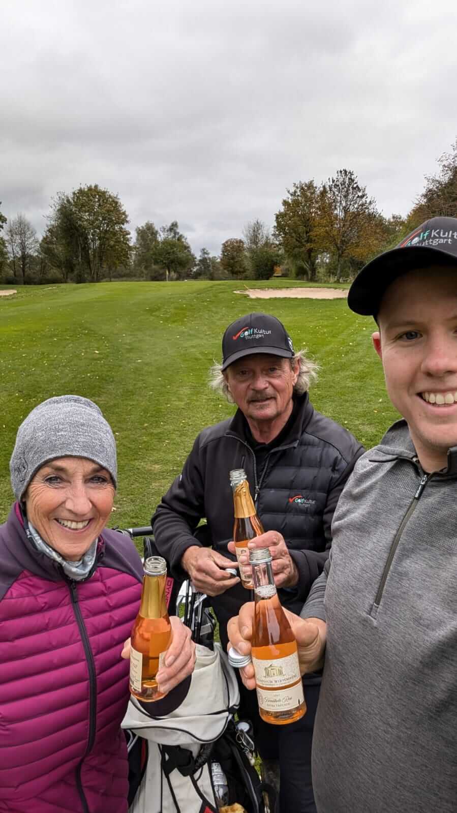 Gegen Ende der Runde stoßen wir mit den mitgebrachten Heroldrebe Piccolos an. Die sind über dreieinhalb Stunden fast kühlschrankkalt geblieben. Mir geht der Alkohol direkt ins Hirn. Nach der Runde gibt es für jeden noch einen Piccolo aus dem Kofferraum des Busses (die Chippingdales lassen grüßen).