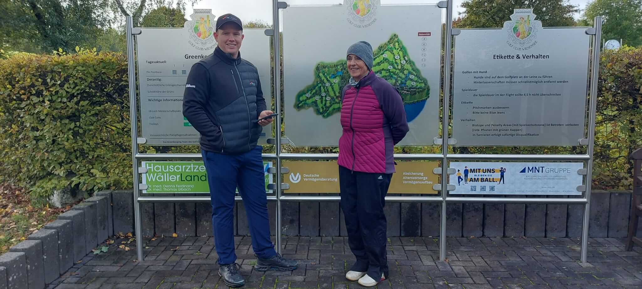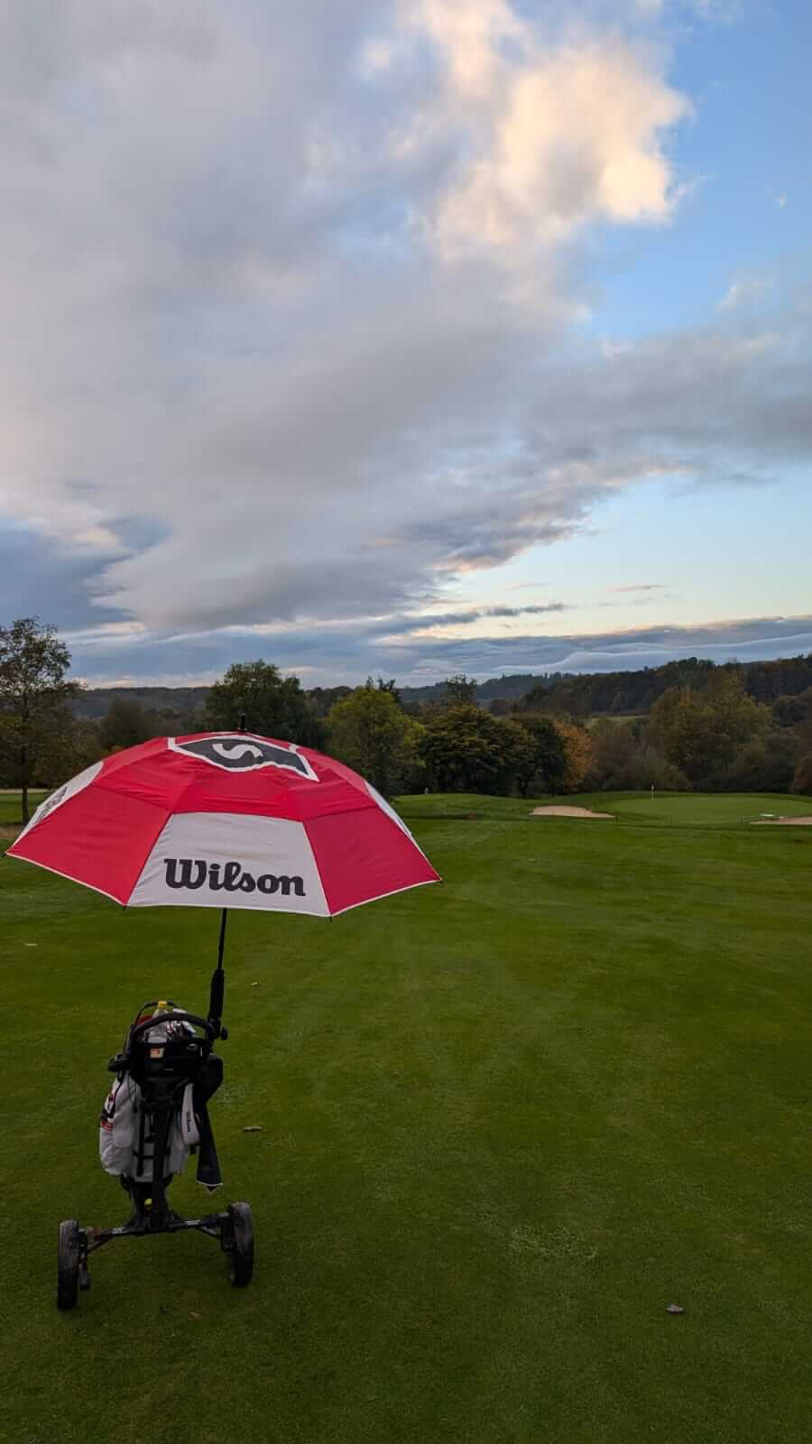 Wir kommen gut durch und sind bereits kurz nach 9:00 Uhr am Golfclub Wiesensee. Mitten in der Pampa. Auf jeden Fall hat nichts geöffnet. Keine Gastro, kein ProShop (macht erst um 10:00 Uhr auf) und der Starter ist zu unflexibel, um uns früher rauszulassen. Allerdings ist auch einiges los auf dem Platz. Die regulären Mitglieder des Clubs wollen sicher die letzten einigermaßen erträglichen Herbsttage zum Spielen nutzen.