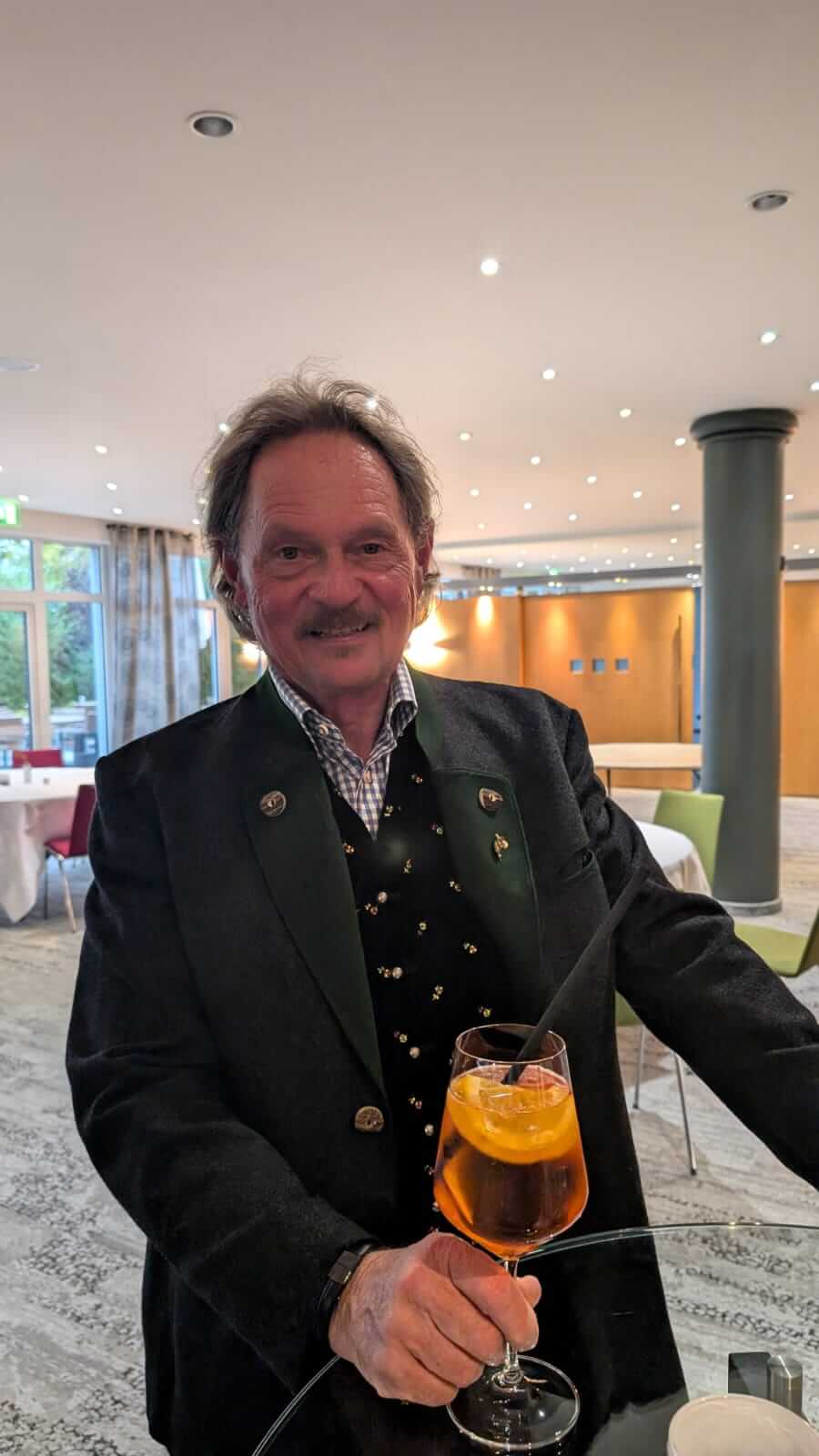Als Heinz wie verabredet in der Bar zum Apéritiv auftaucht, staunen wir nicht schlecht. Er trägt eine prächtige Trachtenweste aus seiner Heimat Kärnten und eine Trachtenjacke. Bei Leon hat es nur zu einem karierten Hemd gereicht.