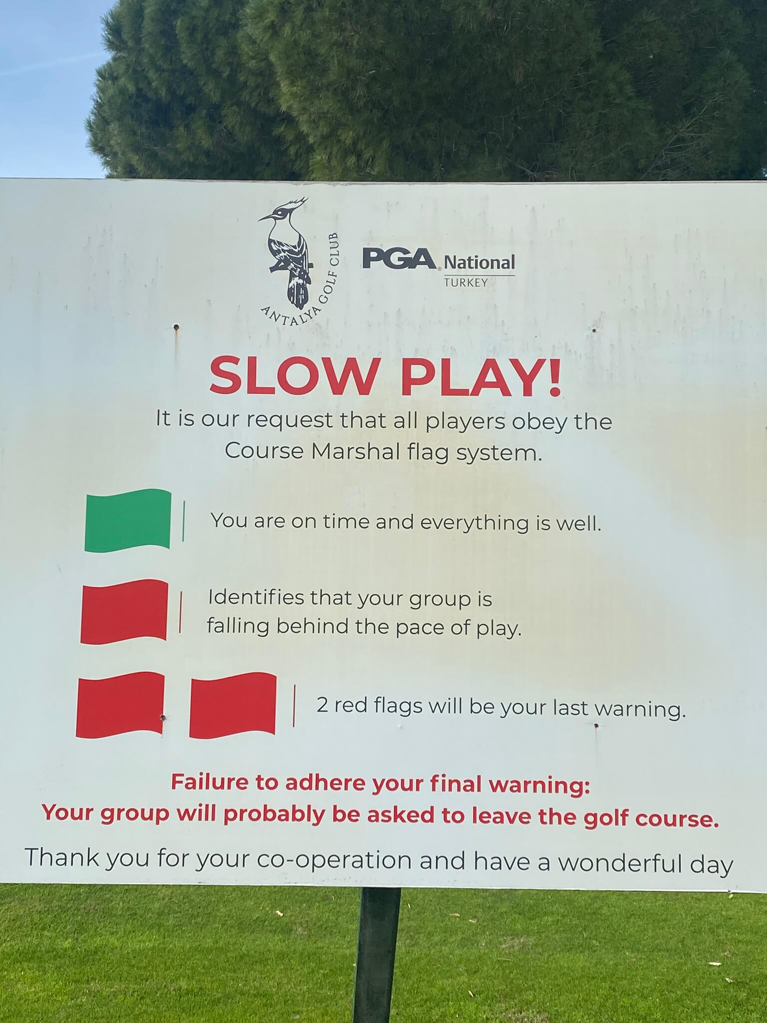 Am Sonntag, unserem ersten Golftag, lacht die Sonne und alle freuen sich auf die erste Golfrunde. Allerdings fällt unsere Gruppe nicht durch zügiges Spiel auf und es gibt immer wieder Ermahnungen des Marshalls. Darüber sind einige dann doch sehr verärgert, weil sie einfach mehr Zeit für die Runde brauchen. Es führt im weiteren auch zu vielen Diskussionen innerhalb der Gruppe und weitere Flight-Änderungswünsche werden geäußert.