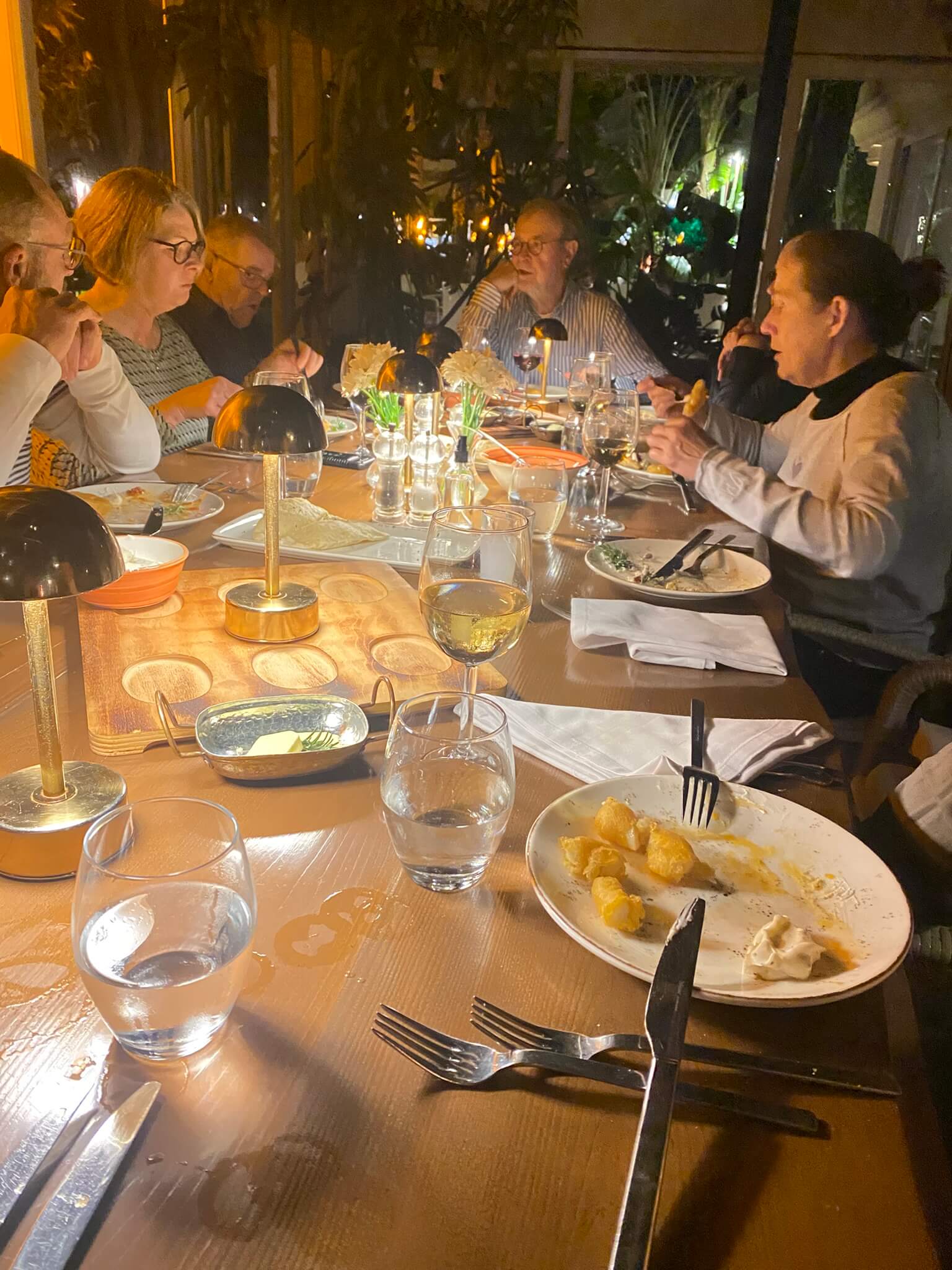 Zurück im Club möchten wir einen Aperitif an der Bar nehmen. Das Ergebnis ist, dass wir innerhalb von einer halben Stunde jeweils drei Prosecco wegsaugen und schon einigermaßen angeheitert zum Abendessen erscheinen. Das Abendessen nehmen wir heute im Gewächshaus ein. In sehr schönem, stimmungsvollem Ambiente wird das türkische Abendessen serviert, und es gefällt allen gut. Lecker ist es auch wieder.