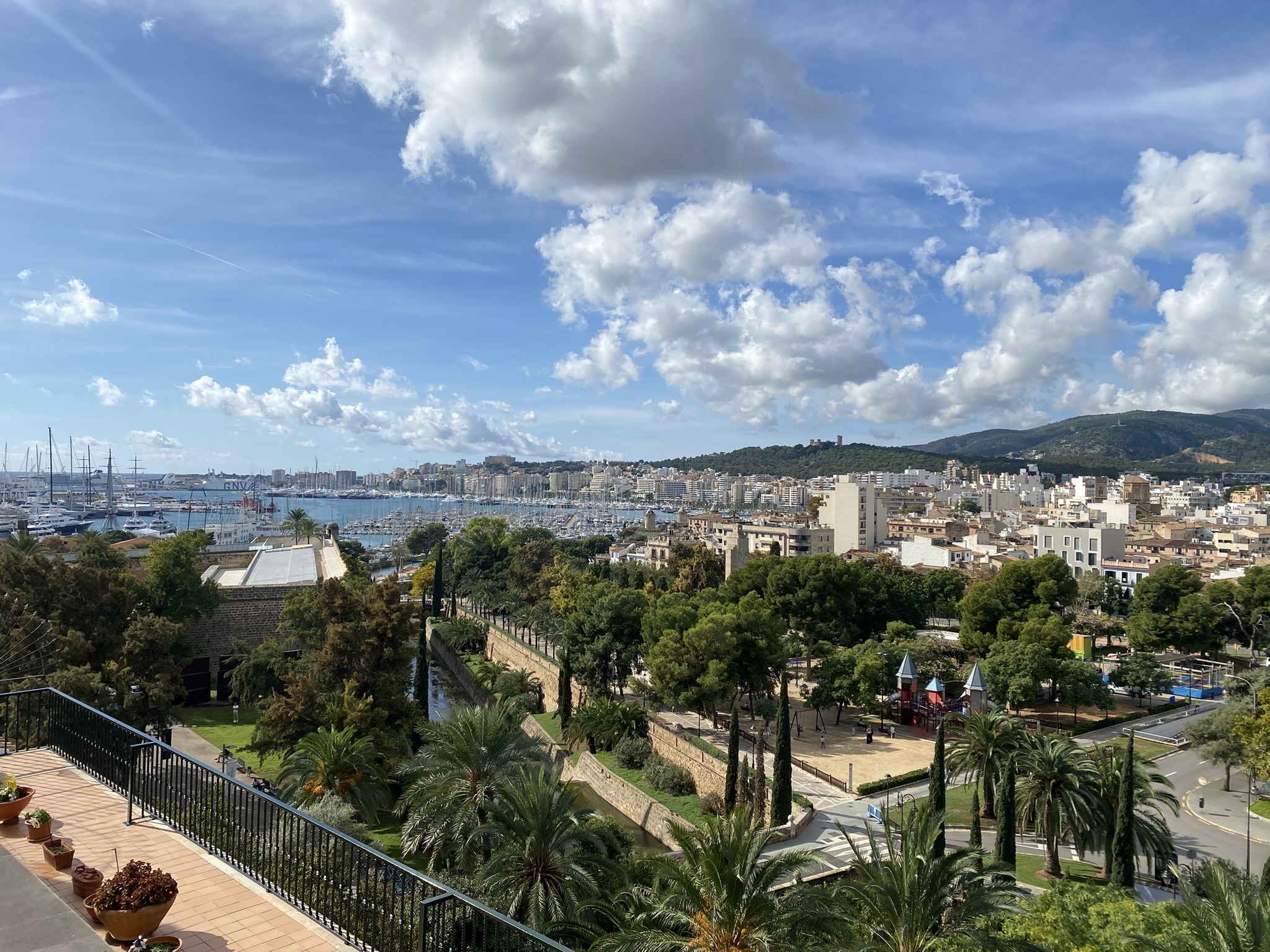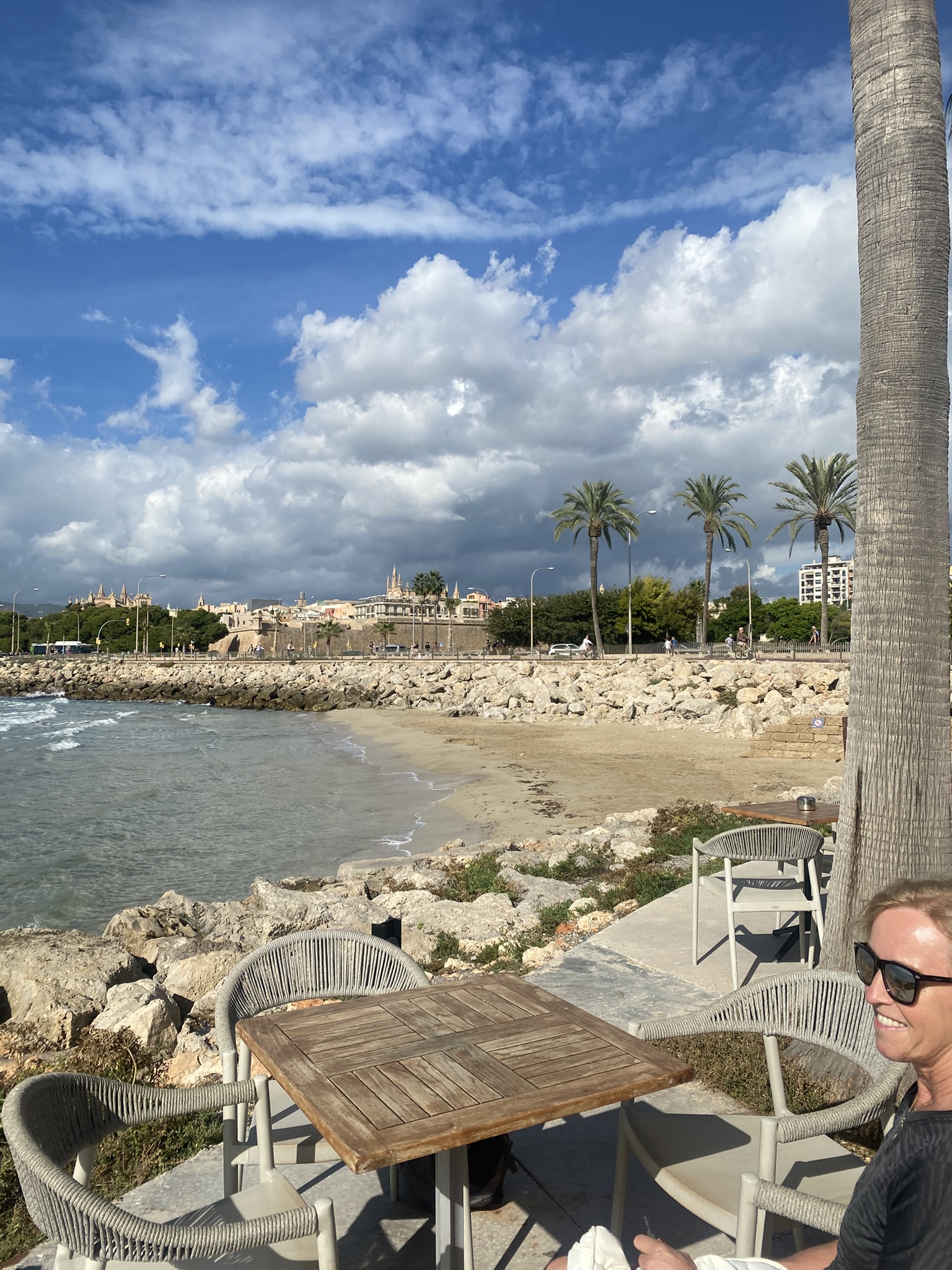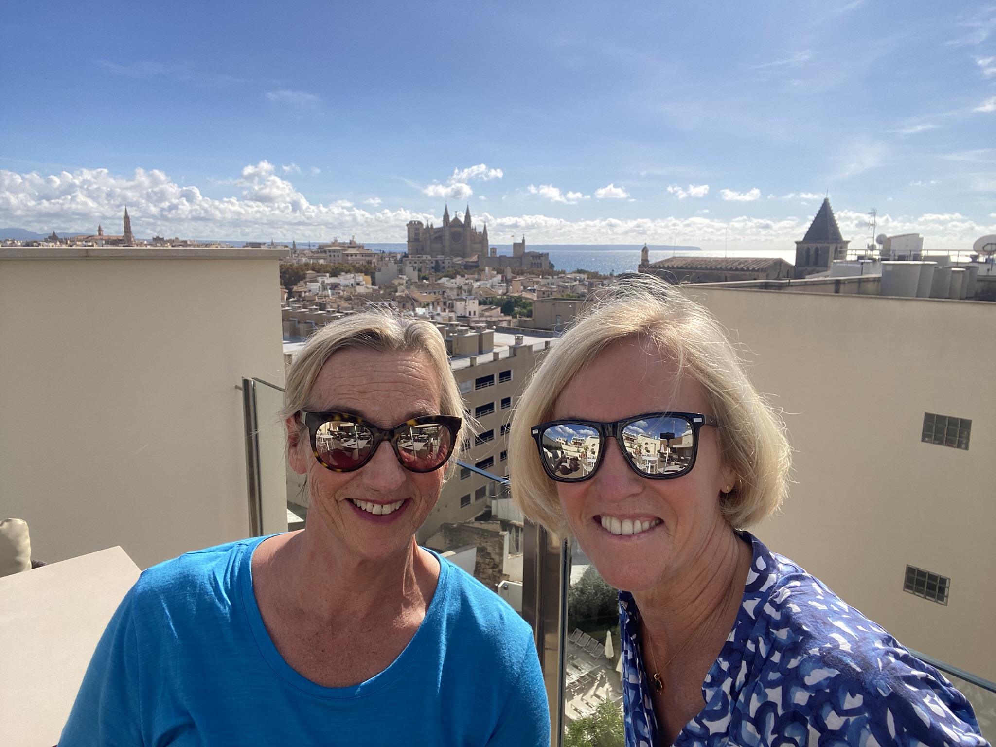 Von der Endhaltestelle sind es nur wenige Minuten zu Fuß zu unserem sehr schönen City-Hotel Saratoga. Die Zimmer sind noch nicht bezugsfertig, daher genießen wir zunächst auf der Dachterrasse ein Glas Wein mit spektakulärem Blick über Palma: Kathedrale, Yachthafen, Dächermeer – alles liegt uns zu Füßen. Später stößt Renate zu uns, und aus einem Glas werden schnell drei – auf fast nüchternen Magen.