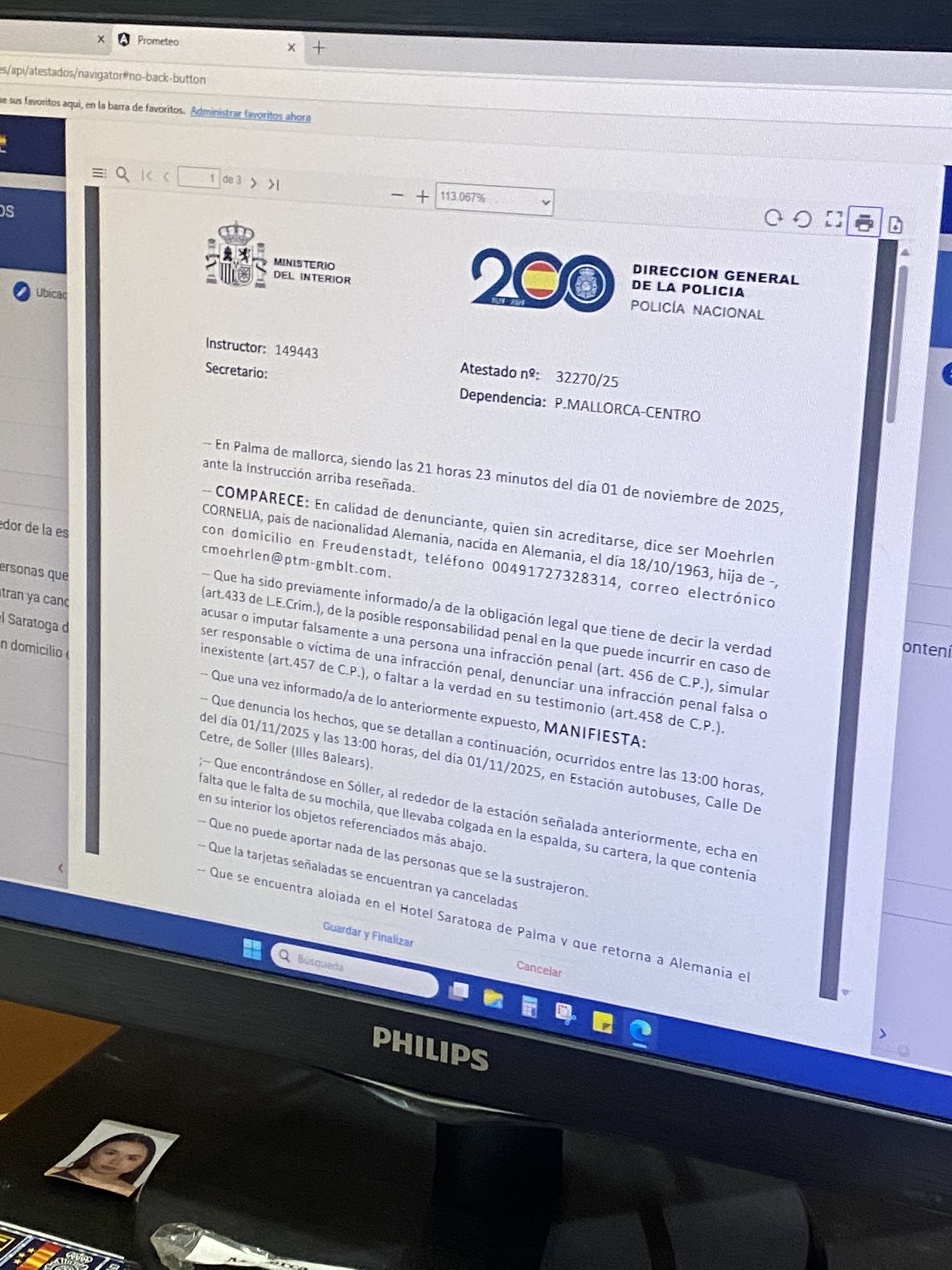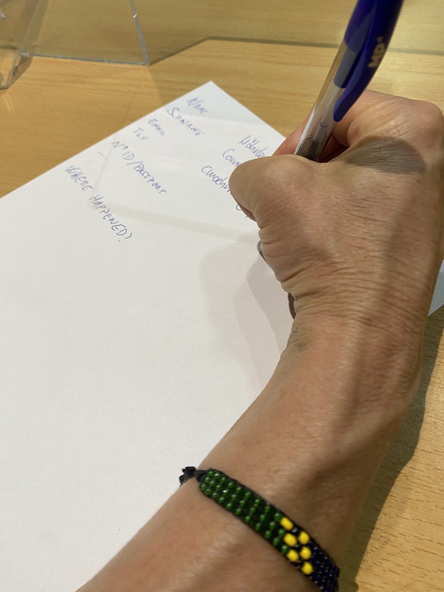 Nach einer Stunde ist der Bericht fertig und wird Coni zur Kontrolle vorgelegt. Leider sind alle relevanten Angaben falsch: Passnummer, E-Mail, Telefonnummer – alles. Nach über fünfeinhalb Stunden ist der Bericht korrigiert, gedruckt und mehrfach gestempelt, und wir sind um eine skurrile Erfahrung reicher.
