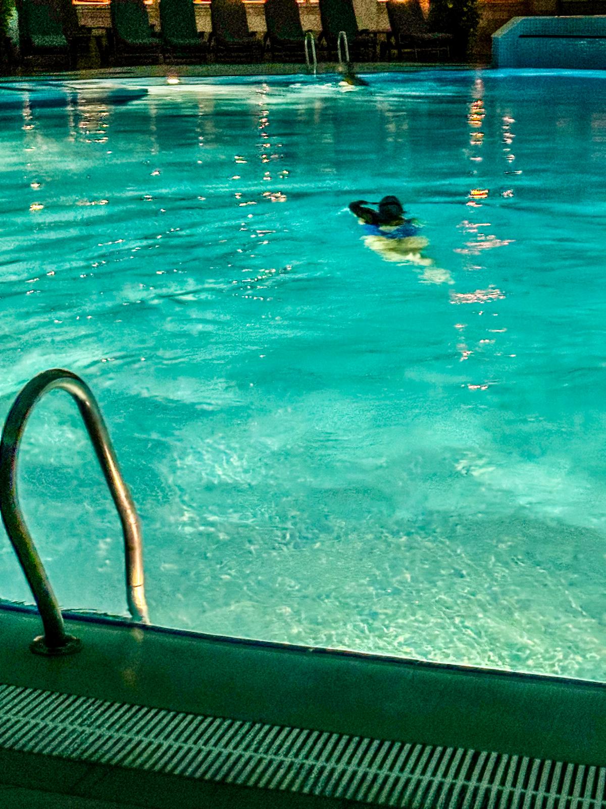 Kurz vor Mitternacht kommen wir im Club an und bekommen sogar noch etwas zu essen. Aber dann ist mit mir nicht mehr viel los und ich gehe schlafen. Mein Zimmer ist im renovierten Teil. Ich habe also ein paar Meter mehr zum Freibad und durchquere um 7 Uhr morgens den Speisesaal im Bademantel.