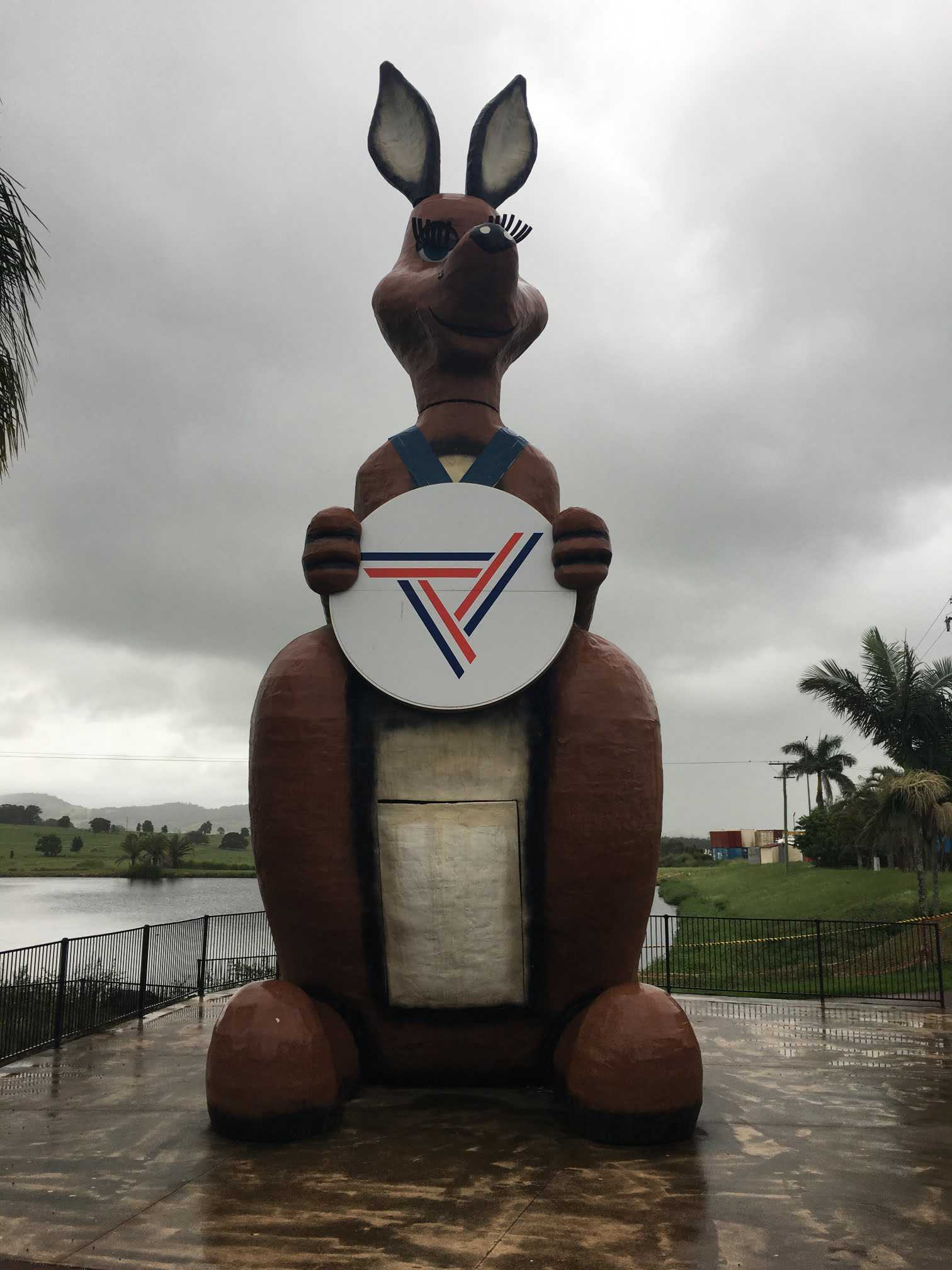 Bei der Puma Roadhouse Kybong Station hat Harry uns ausgeladen und nun warten wir auf den Bus, der uns zum Rainbow Beach fahren wird. Vor der Tür steht ein 10 Meter hohes Riesenkänguruh mit langen Wimpern. Es heißt Matilda, so wie die Station hier.