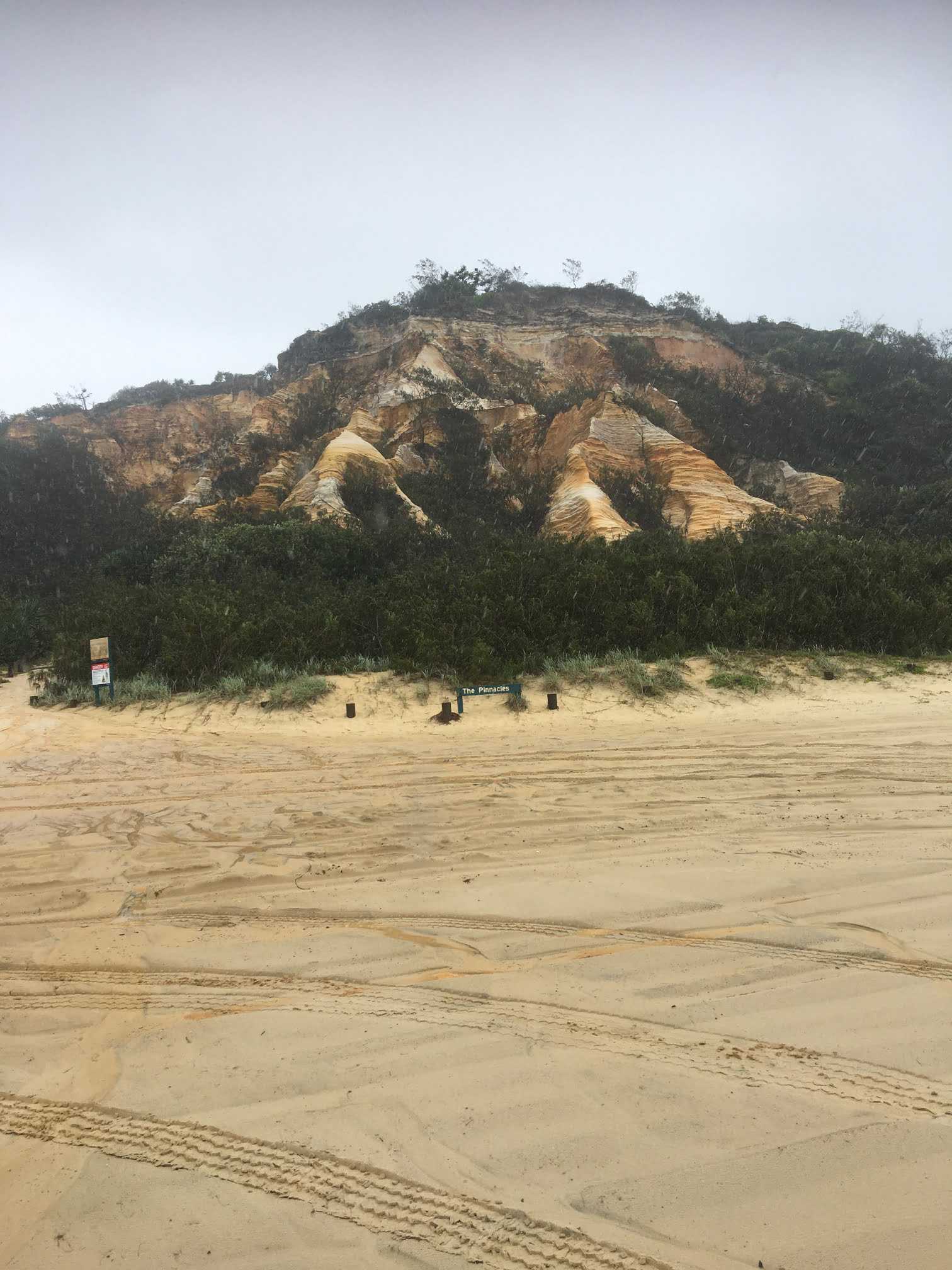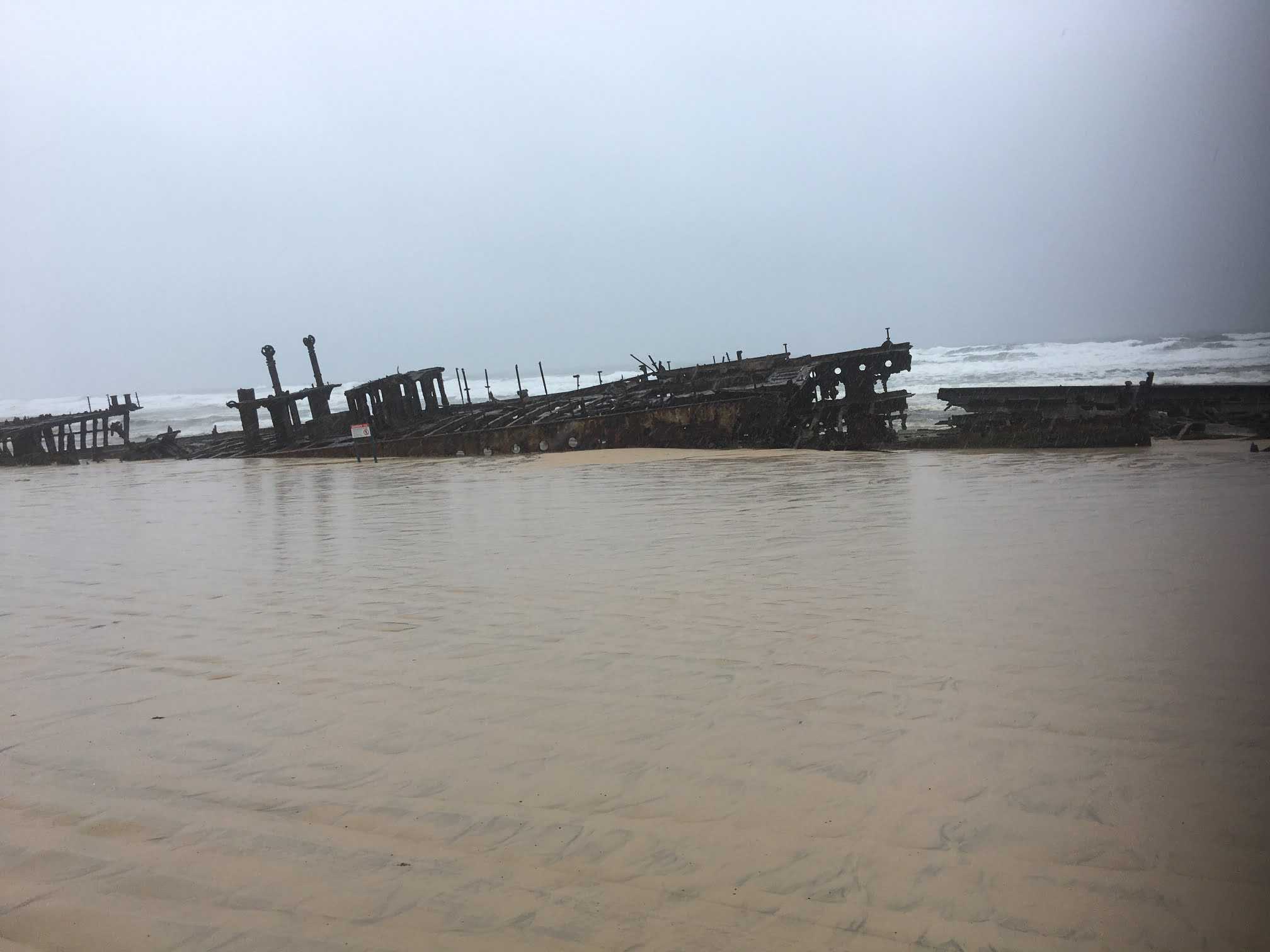 Noch lange sind wir mit unserem Panzer am Strand entlang gefahren und haben verschiedene Sehenswürdigkeiten wie die Pinnacles und das alte Schiffswrack ( Maheno Wreck) durch die nassen Autoscheiben begutachtet.