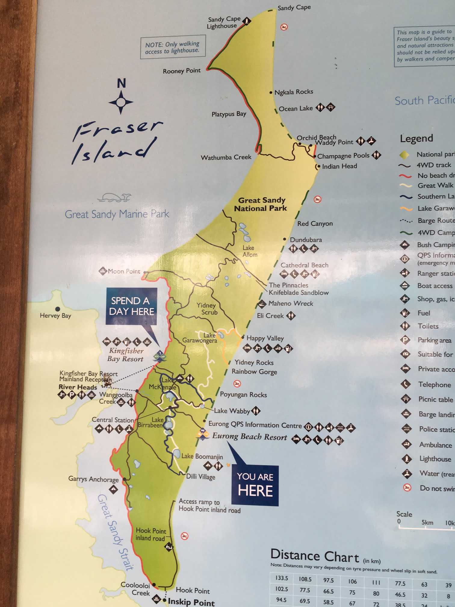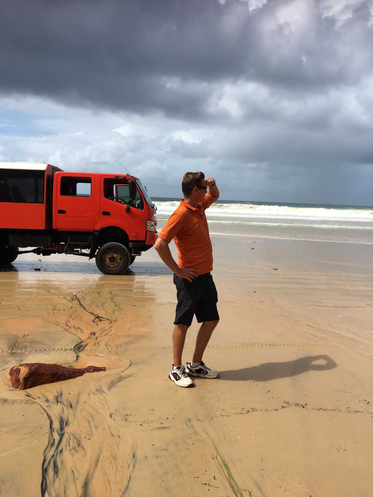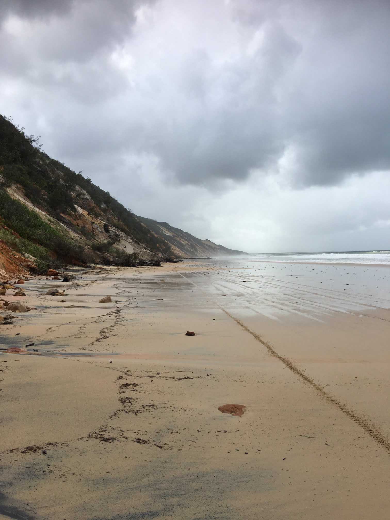 Die Insel ist ca. 125 km lang und 15 km breit. In der Mitte ist Regenwald, weil es ganz viel Süßwasser dort gibt und dann die kilometerlangen Sandstrände, an denen man mit 4WD entlangheizen kann. Ganz bestimmt ein Traum bei schönem Wetter. Soviel wie heute hat es hier schon seit 10 Jahren nicht geregnet.