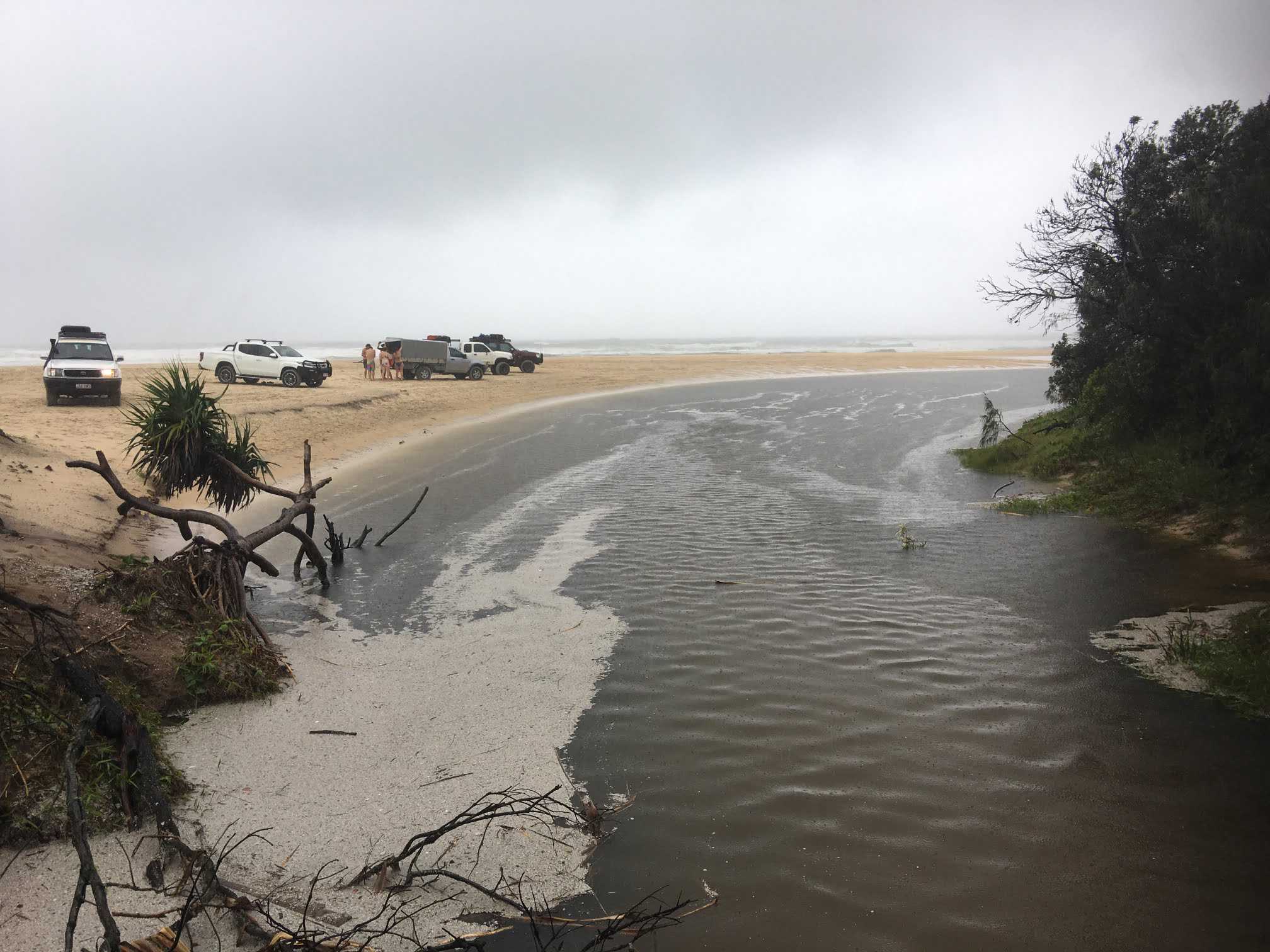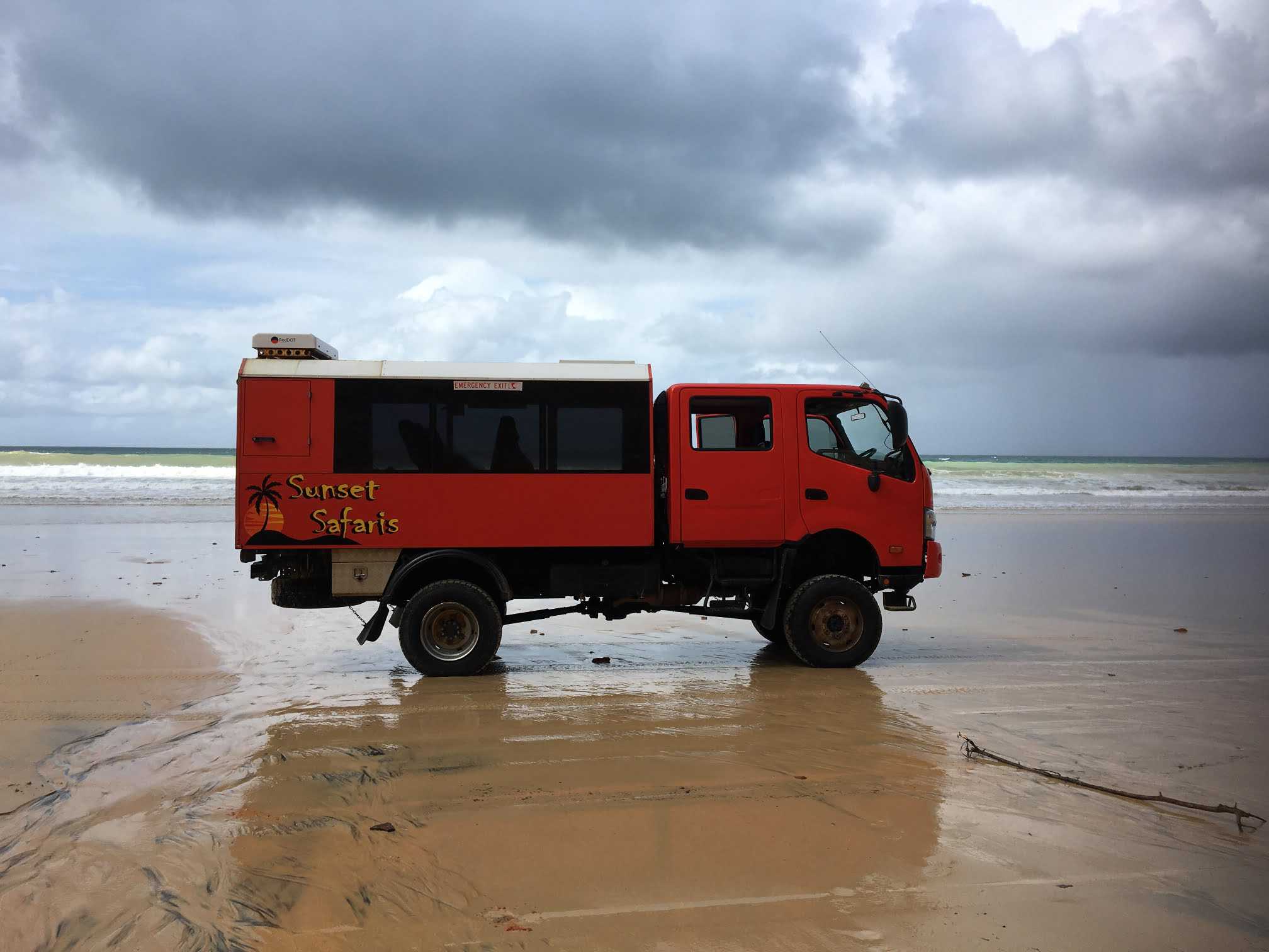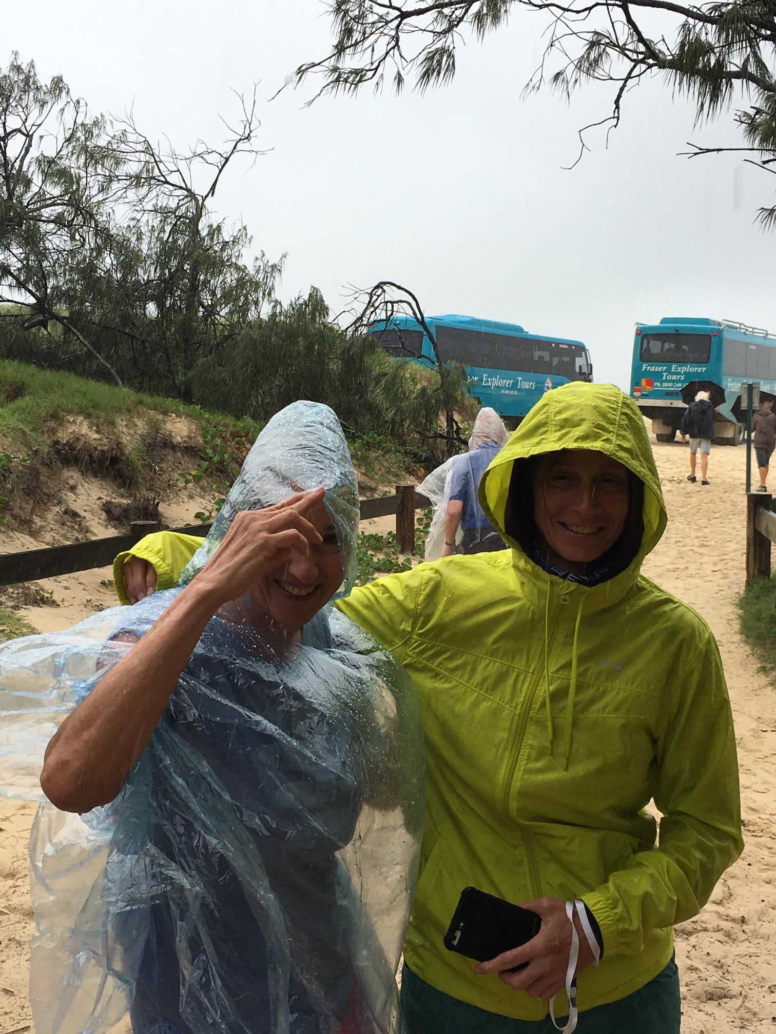 Die Insel ist ca. 125 km lang und 15 km breit. In der Mitte ist Regenwald, weil es ganz viel Süßwasser dort gibt und dann die kilometerlangen Sandstrände, an denen man mit 4WD entlangheizen kann. Ganz bestimmt ein Traum bei schönem Wetter. Soviel wie heute hat es hier schon seit 10 Jahren nicht geregnet.