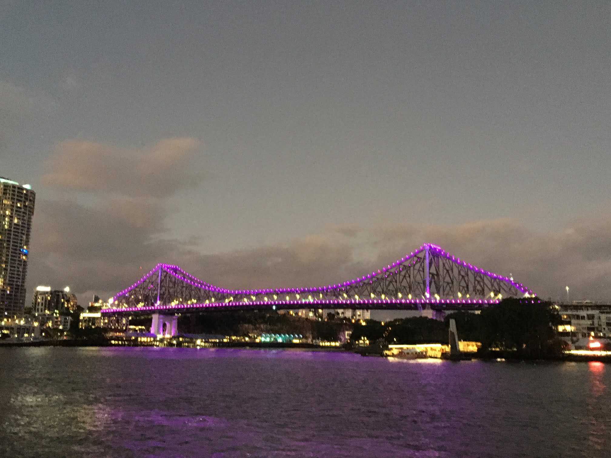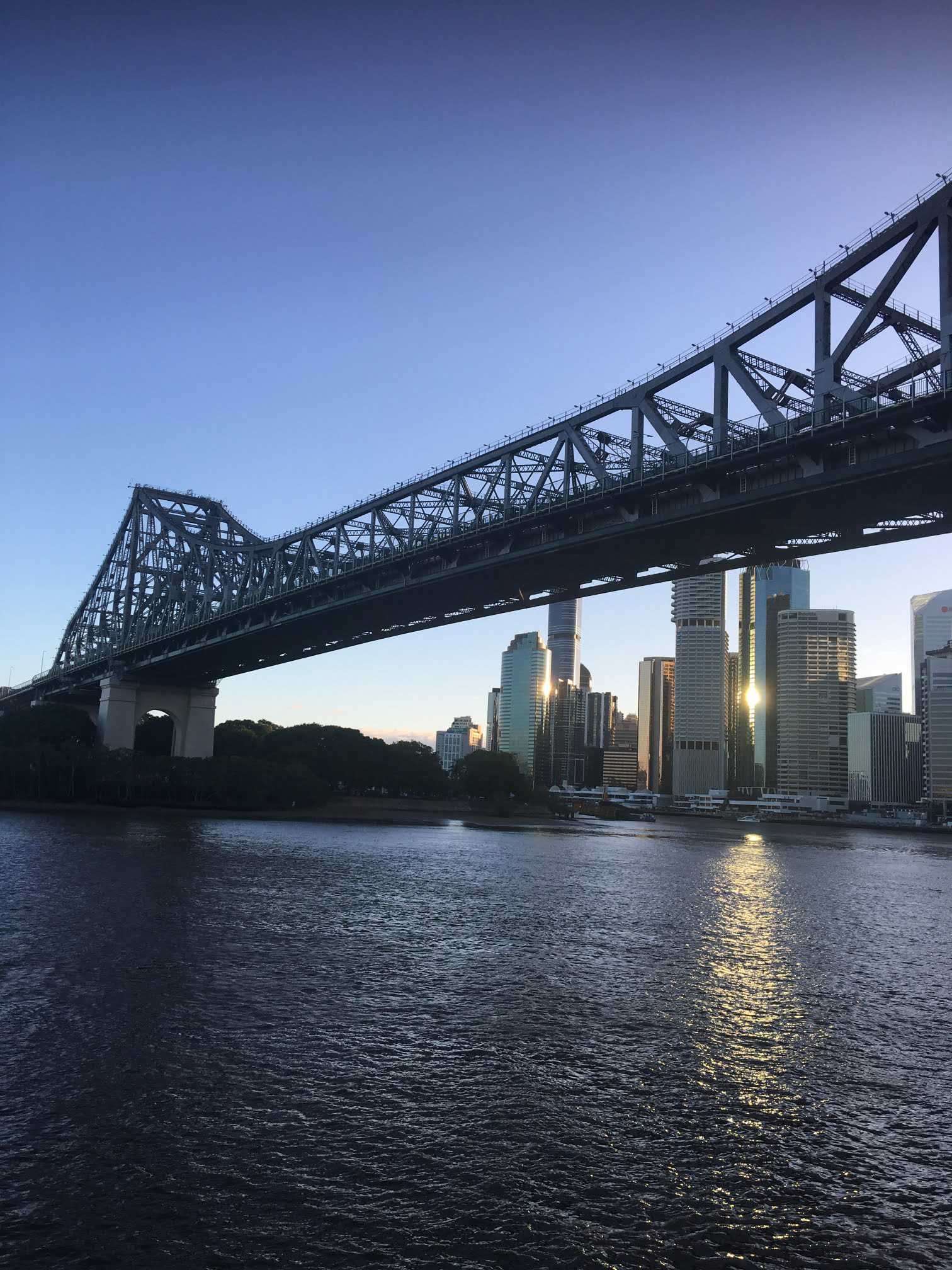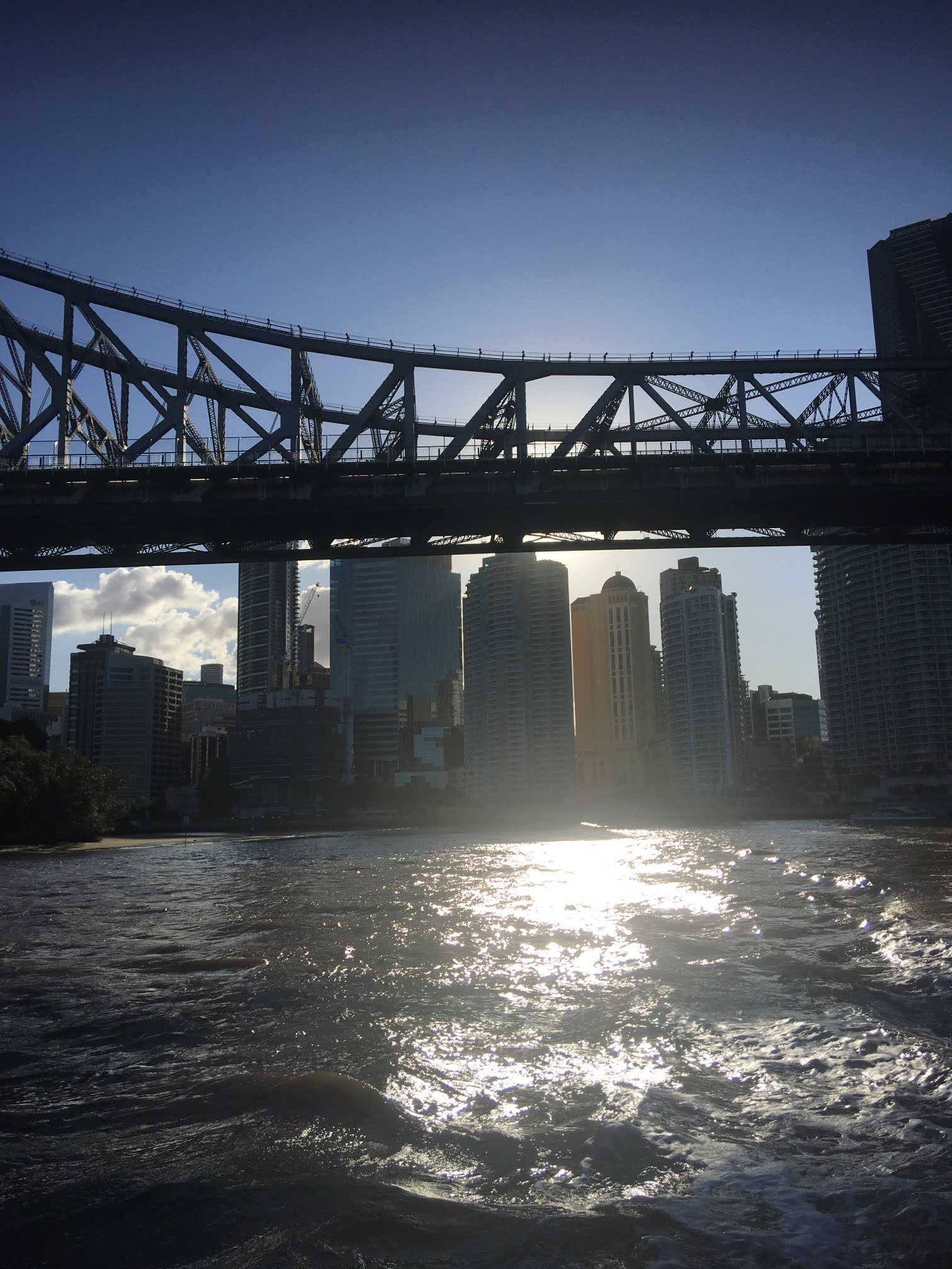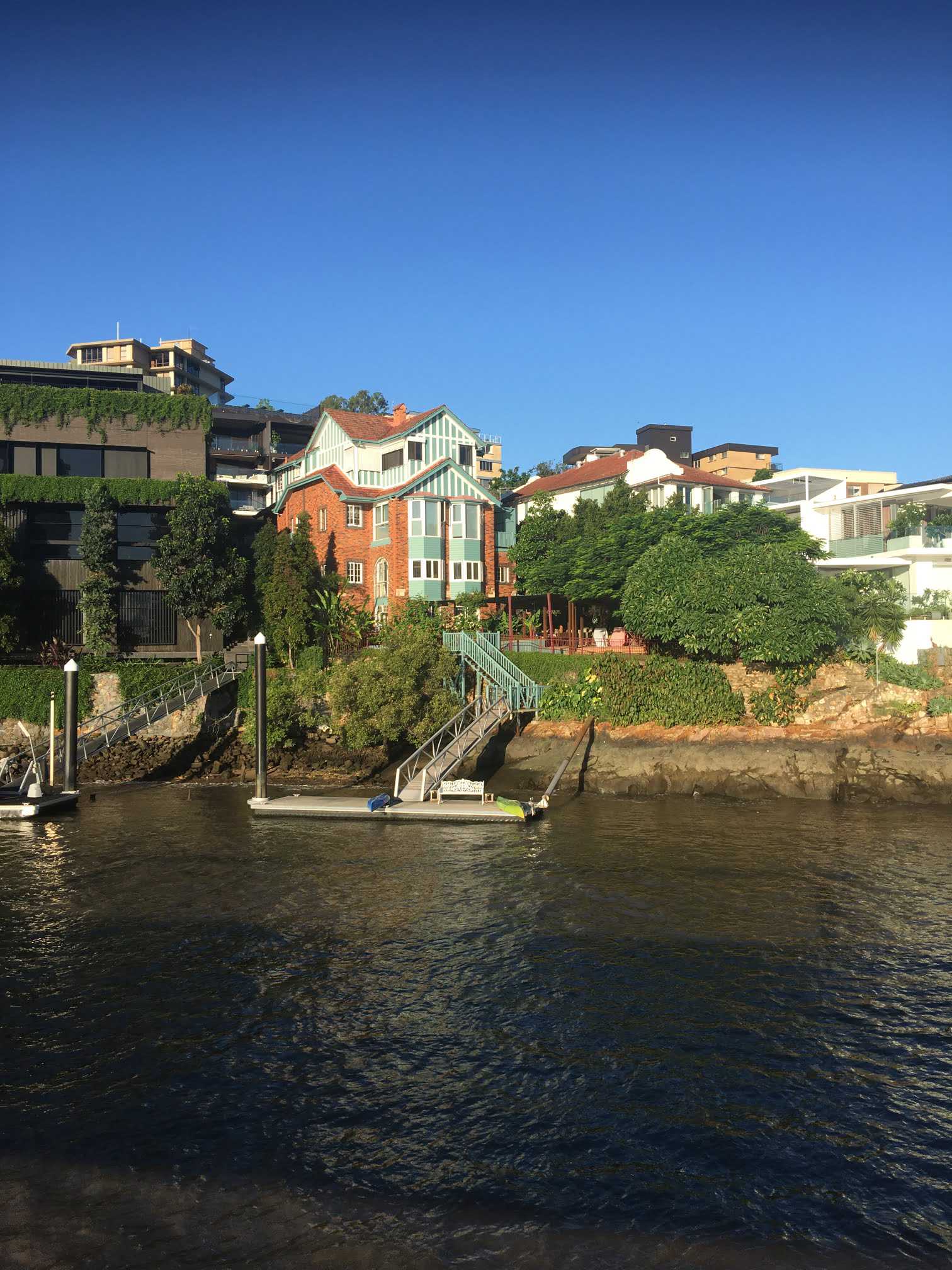Mit einer kostenlosen Fähre kann man auf dem Fluss herumschippern und noch mehr Sightseeing machen. Es wurde schon dämmrig als wir am Riverside Walk tolle Häuser direkt am Fluss bestaunt haben und die Sonne über der Story Bridge untergehen sahen.