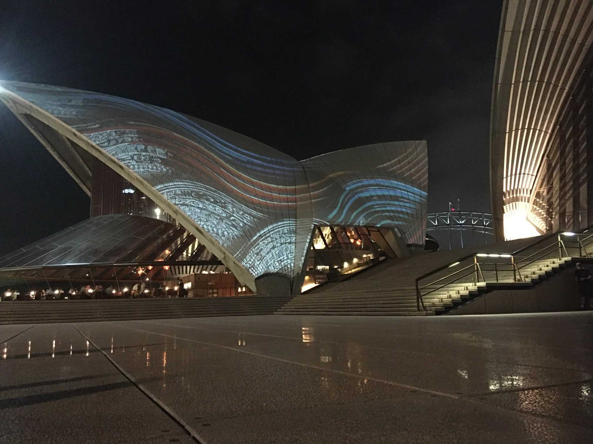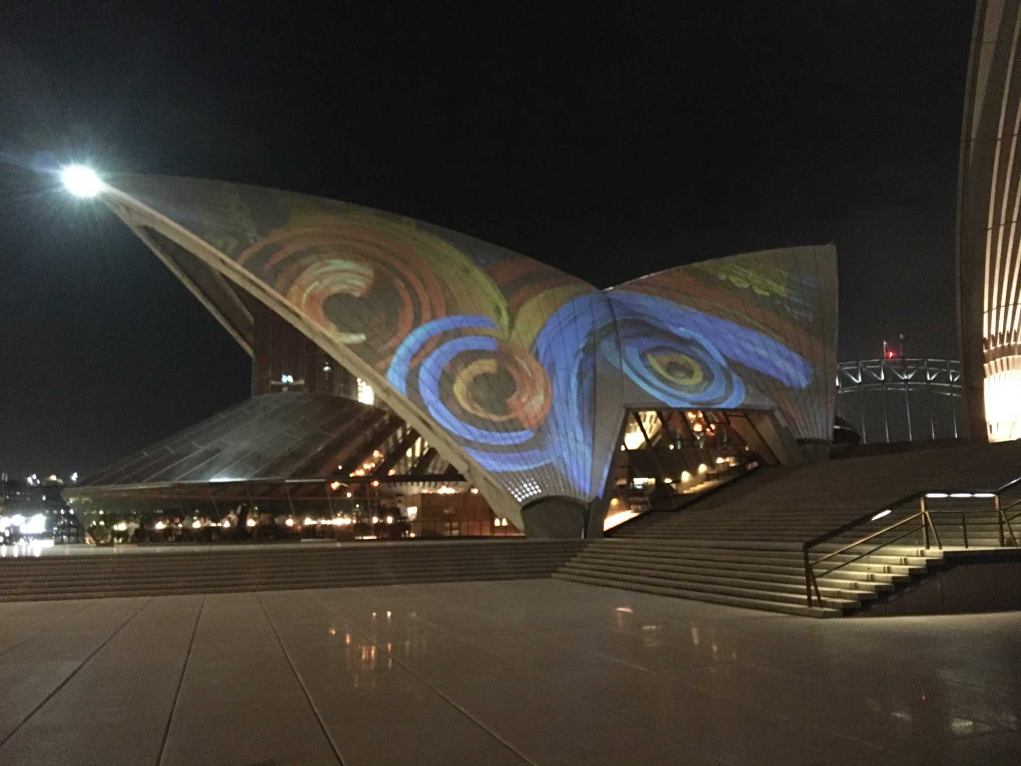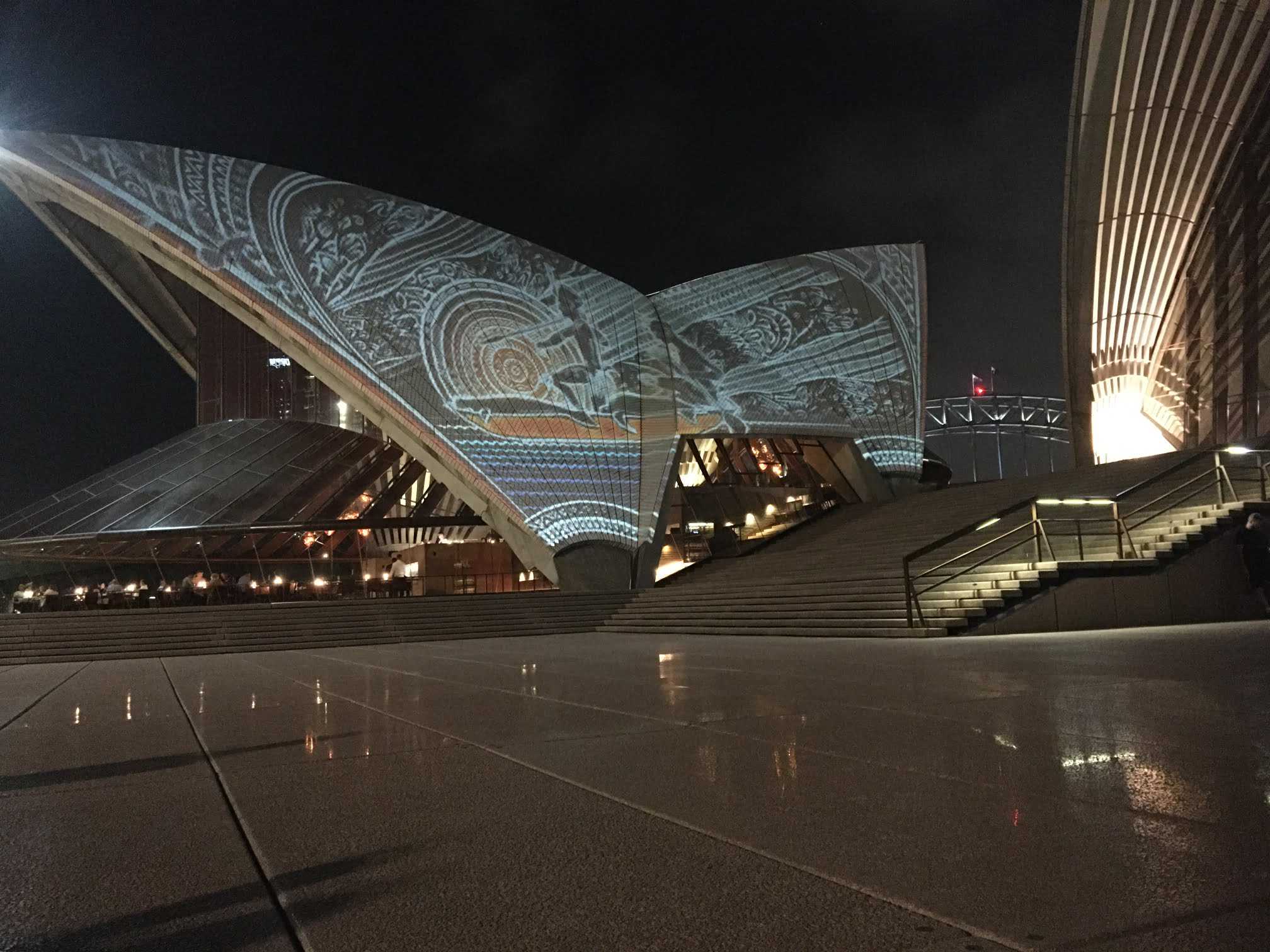 Trotz des starken Sturms sind wir noch zur Oper gelaufen, da hier ab 9.00 pm auf das östliche Segel des Sydney Opernhauses wunderschöne Aborigines Motive projiziert werden, sozusagen für uns die Einstimmung für die nächsten Tage.