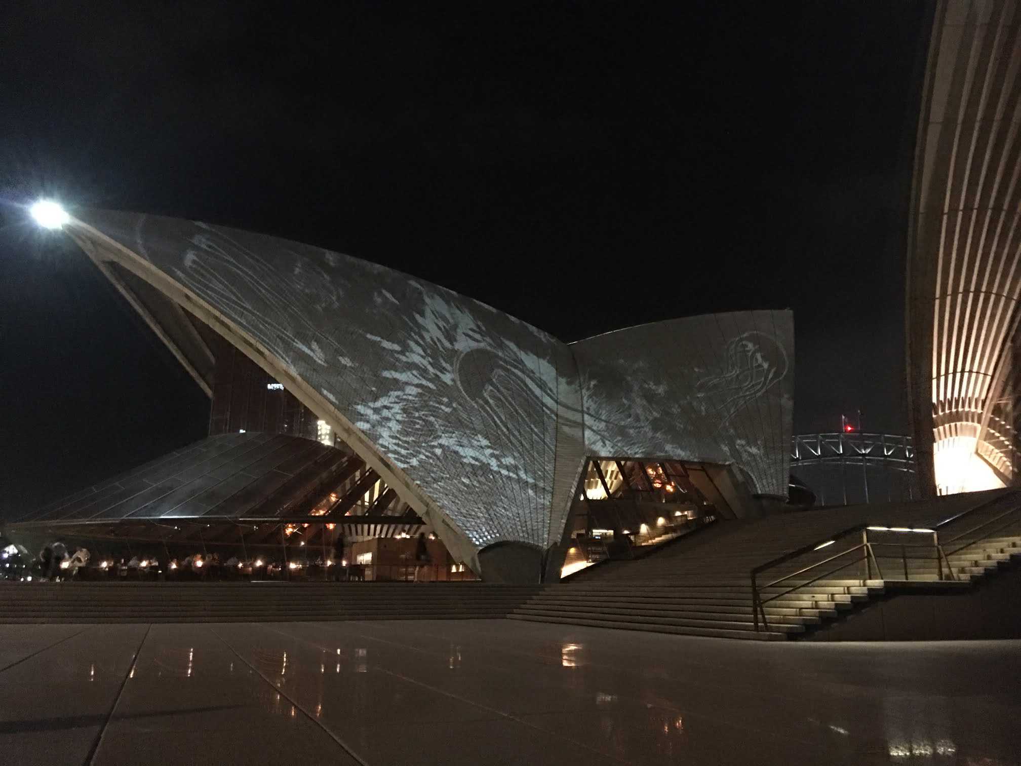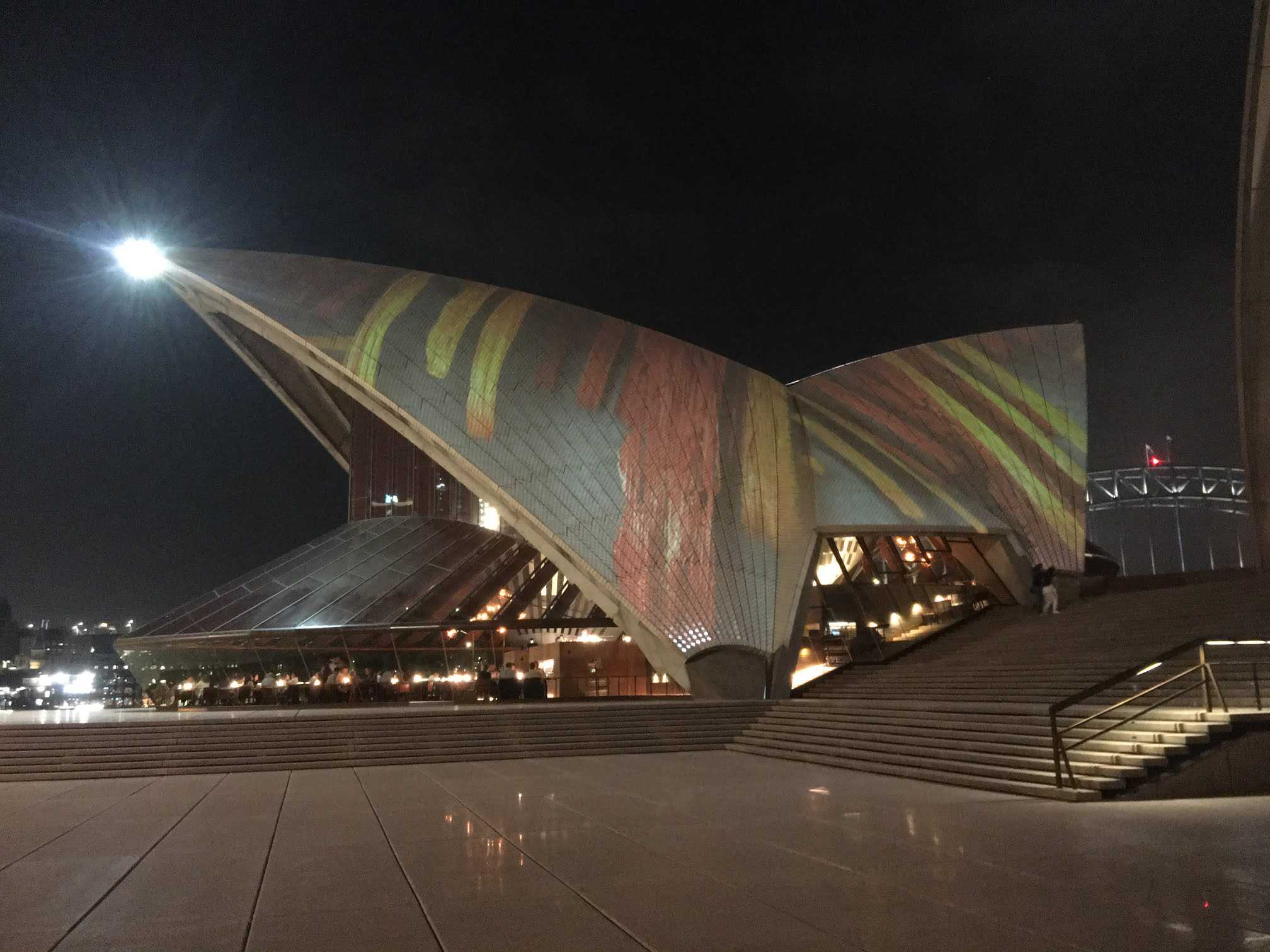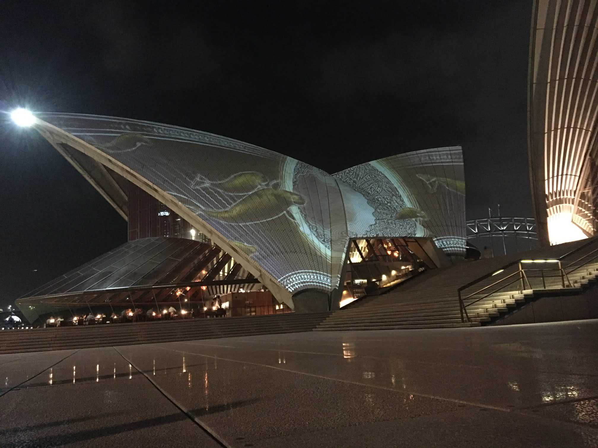 Trotz des starken Sturms sind wir noch zur Oper gelaufen, da hier ab 9.00 pm auf das östliche Segel des Sydney Opernhauses wunderschöne Aborigines Motive projiziert werden, sozusagen für uns die Einstimmung für die nächsten Tage.